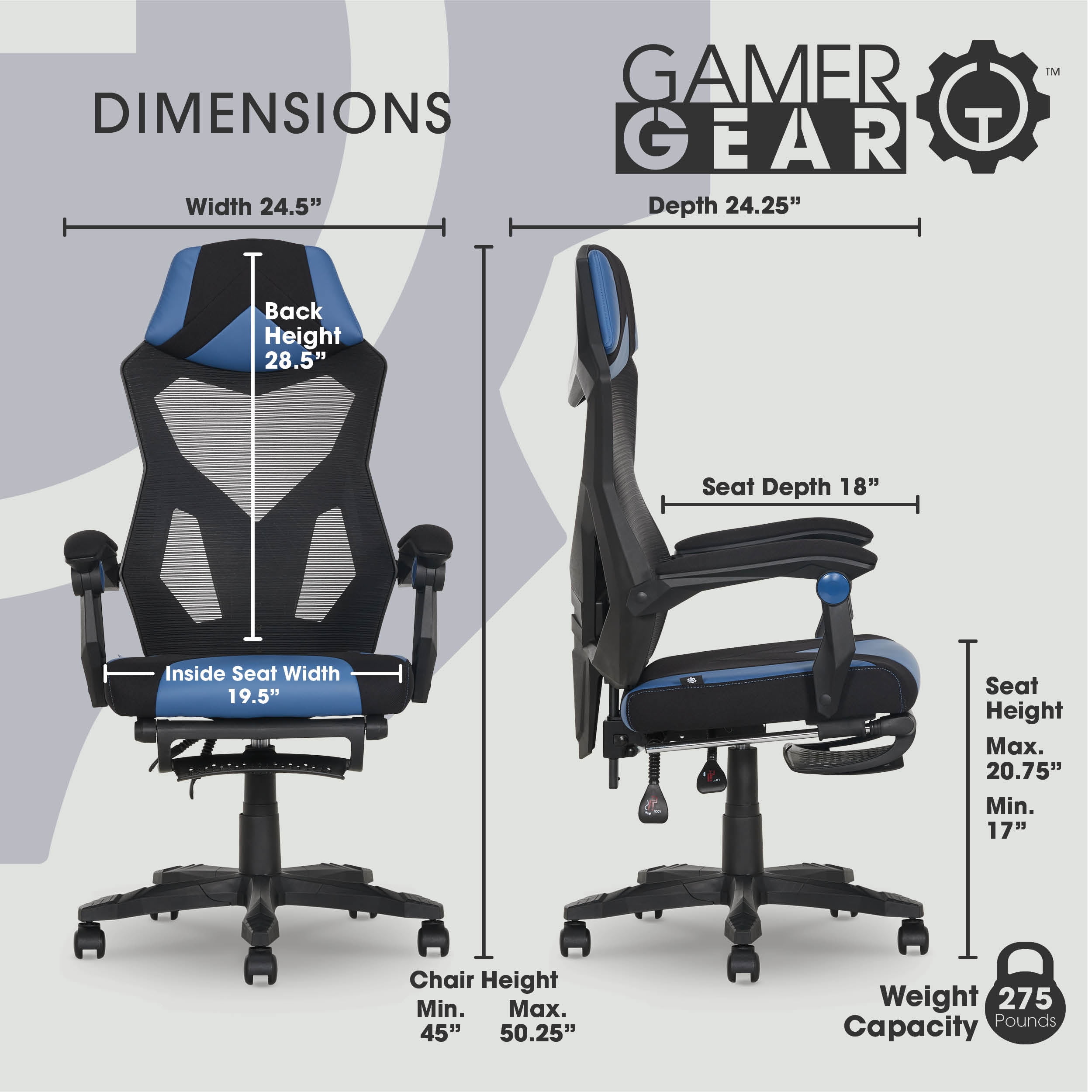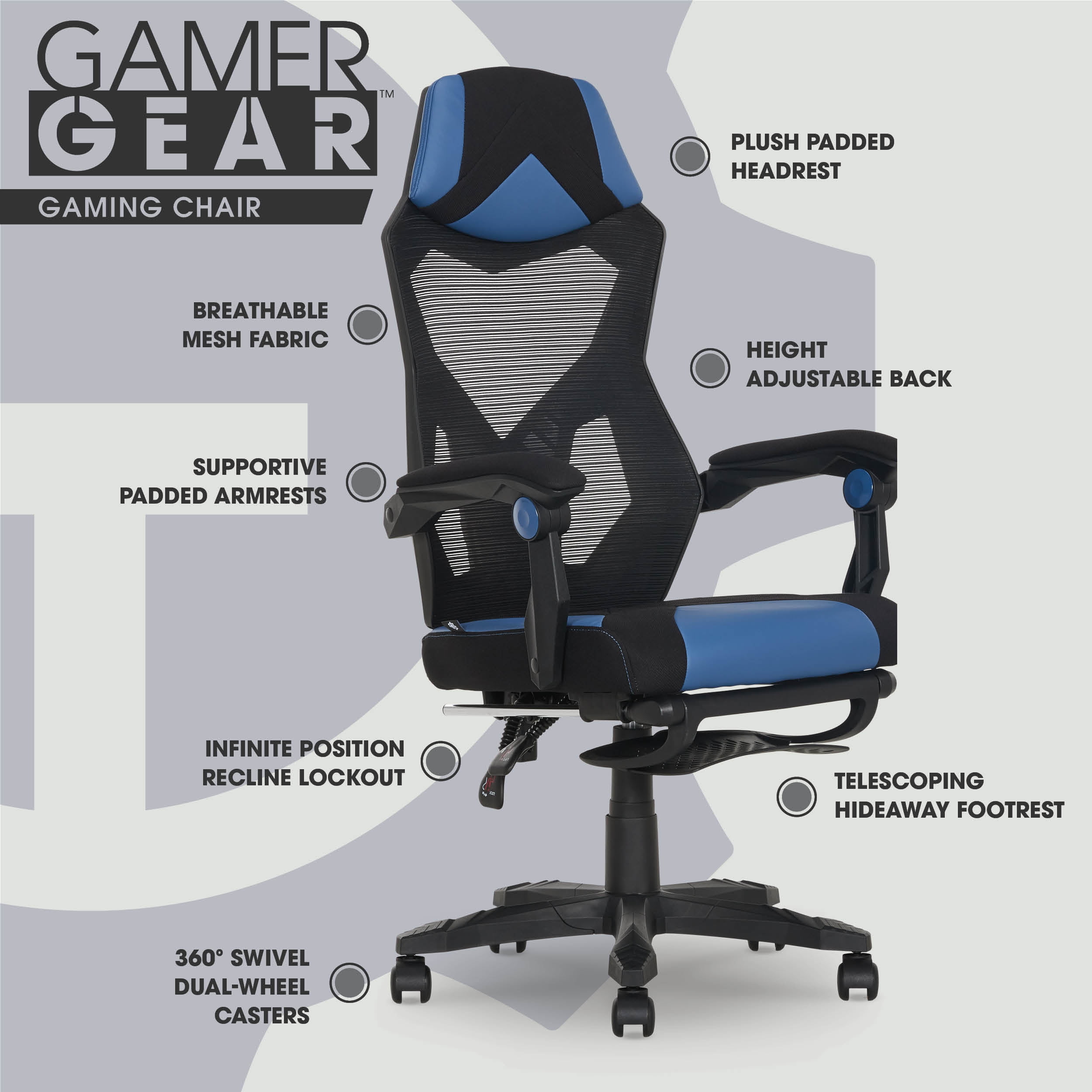 When it comes to getting your game on, you need a chair that can keep up. The Gamer Gear Mesh Office Chair is built for comfort and performance with breathable mesh on the height adjustable backrest. Plus, the dual pivot point arm rest design allows the arm pads to move in a linear motion along with the back recline angle for uninterrupted comfort in any position, so you can stay focused on your game. And when you're ready to take a break, just extend the footrest and relax. Whether you're working or gaming, the Gamer Gear Mesh Office Chair is the perfect choice for peak performance.